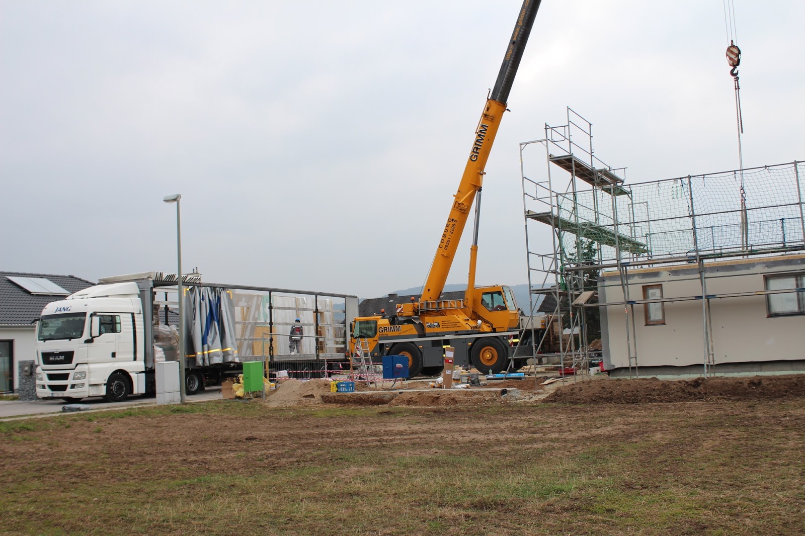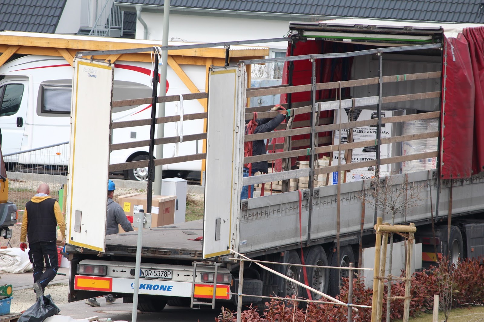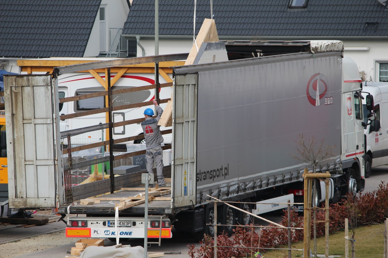 …einzelne, fertige Wände ordentlich verpackt auf ein bis zwei Lkw’s direkt aus Polen.