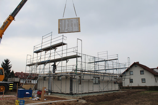 • Bodenplatte herstellen: Frostschürze ausheben und betonieren, Folie einlegen, Perimeterdämmung 10 cm stark liefern und einbauen, Bodenplatte armiert 20 cm stark, Beton C 25/30 liefern, einbauen und glätten